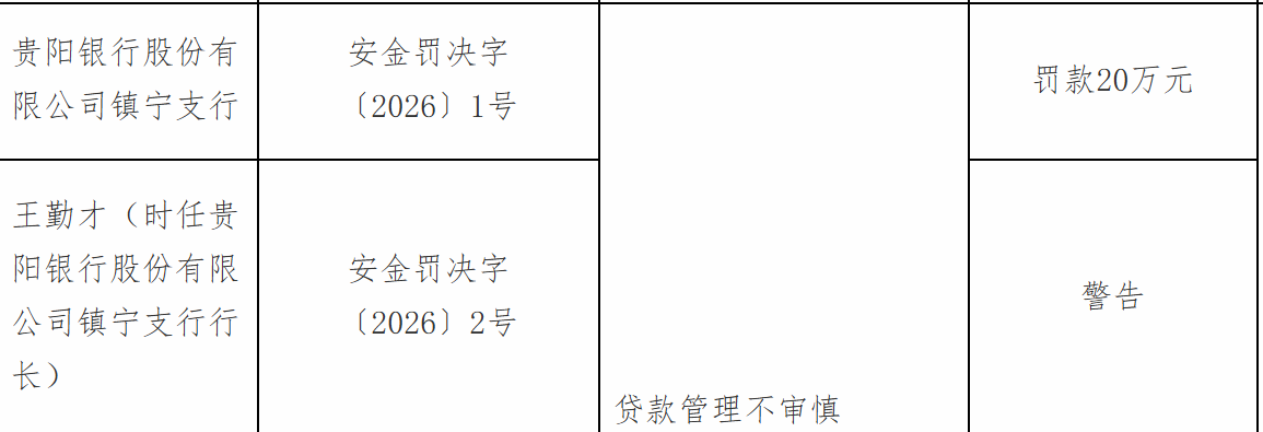 1月8日富灯网,国家金融监督管理总局安顺监管分局行政处罚信息公开表显示,贵阳银行股份有限公司镇宁支行因贷款管理不审慎被罚款20万元;责任人王某才被警告。