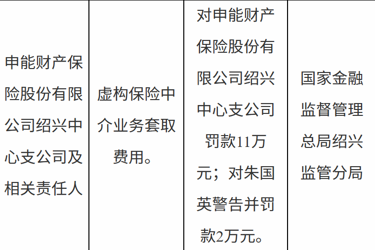 1月8日中国银河证券,国家金融监督管理总局绍兴监管分局行政处罚信息公开表显示,申能财产保险股份有限公司绍兴中心支公司因虚构保险中介业务套取费用被罚款11万元;责任人朱某英被警告并罚款2万元。